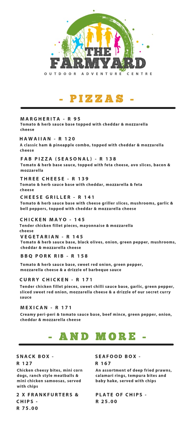 • Options include meals (menu attached) and designated braai areas with braai packs, side dishes and wood for purchase. Pre-booking of braai area (incl. braai packs, sides etc.) is essential.